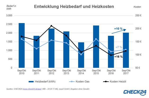 Prozent steigenHeizen mit Gas und Öl kostet zu Beginn der aktuellen Heizperiode deutlich mehr als noch im vergangenen Jahr. Hauptgrund: Der September war 2017 deutlich kühler als 2016. Der durchschnittliche Heizbedarf war dadurch im September und Oktober 2017 zehn Prozent höher als im entsprechenden Vorjahreszeitraum. 1)