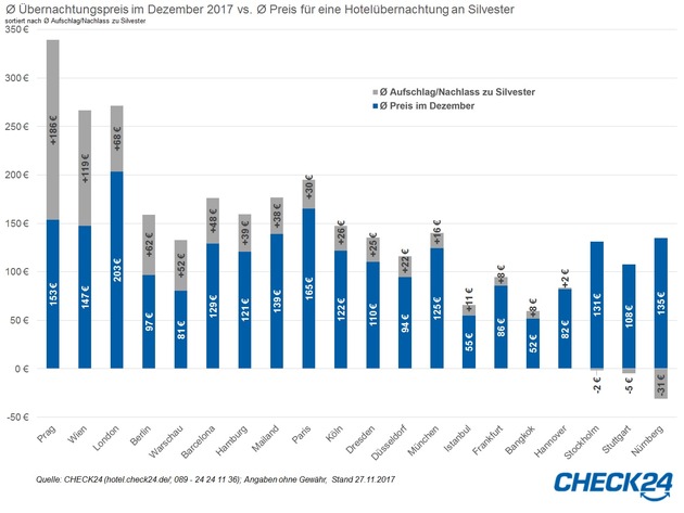 *Berücksichtigt wurden alle Suchanfragen für Hotels aller Sternekategorien im CHECK24-Hotelvergleich; beliebteste Destinationen beziehen sich auf Hotelbuchungen mit Übernachtungen inkl. der Nacht vom 31.12.17 auf den 01.01.18; durchschnittliche Preise für eine Hotelübernachtung zu Silvester und durchschnittliche Dezemberpreisniveaus in den 20 beliebtesten Destinationen zum Jahreswechsel verfügbar unter: http://ots.de/hRIxJ