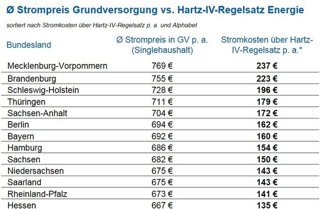 Am stärksten von der Differenz zwischen Strompreis und dem Regelsatz betroffen sind Hartz-IV-Empfänger in Mecklenburg-Vorpommern. Sie zahlen jährlich 237 Euro mehr für Strom als die Regelleistung vorsieht. Am geringsten ist die Lücke in Bremen. Dort beträgt sie trotzdem noch 86 Euro jährlich.