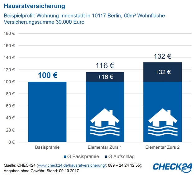 In der niedrigsten Hochwassergefährdungszone (ZÜRS-Zone 1) erhalten Verbraucher Elementarschutz für ihren Hausrat ab sieben Euro pro Jahr. Im Schnitt der 88 betrachteten Tarife verteuert die Elementarabdeckung den Versicherungsbeitrag jährlich nur um 16 Euro. ZÜRS-Zone 1 umfasst gut 91 Prozent der Immobilien in Deutschland.3) Weitere sieben Prozent der Adressen liegen in ZÜRS-Zone 2. Für diese Gebiete kostet die Absicherung gegen Elementarschäden durchschnittlich 32 Euro pro Jahr. Der Aufpreis liegt zwischen 13 und 216 Euro - ein Vergleich verschiedener Tarife lohnt sich daher. "Über 98 Prozent der Immobilien in Deutschland können problemlos gegen Elementarschäden versichert werden", sagt Benjamin Brook, Geschäftsführer Hausratversicherung bei CHECK24. Und auch für Verbraucher aus niedrigen Hochwassergefährdungszonen ist diese Police sinnvoll. Ein Großteil der Wasserschäden ensteht abseits der großen Flüsse beispielsweise durch Starkregen und Schneeschmelze.4)