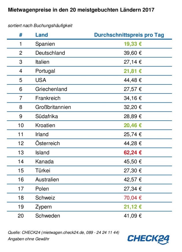 Kroatien neu in den Top TenSpanien ist das beliebteste Ziel für einen Urlaub mit Mietwagen - trotzdem sind Leihautos dort besonders günstig. Im Vergleich der 20 meistgebuchten Länder 2017 liegt der durchschnittliche Preis pro Tag nur in Spanien unter 20 Euro. Im Preisranking knapp dahinter landen Kroatien, Zypern und Portugal.*