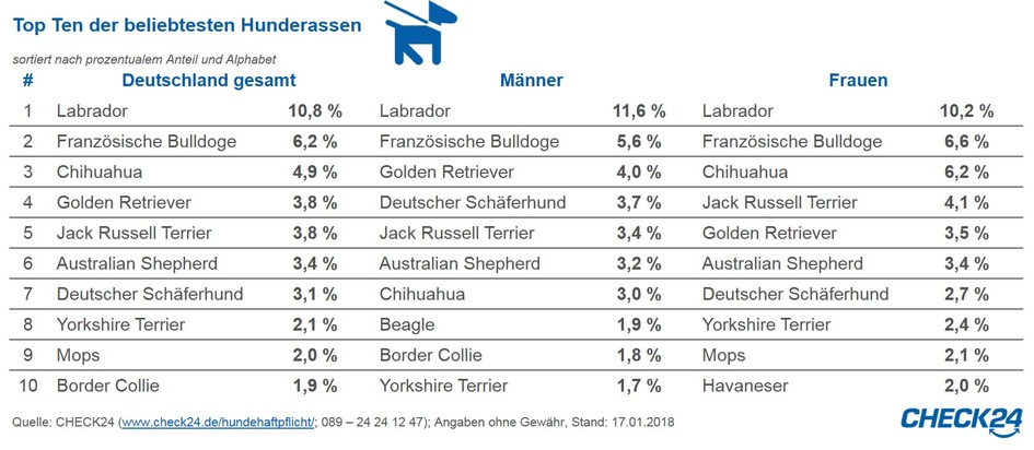 Der Labrador ist der beliebteste Hund der CHECK24-Kunden. Im vergangenen Jahr schlossen 10,8 Prozent der Verbraucher über das Vergleichsportal eine Hundehaftpflichtversicherung für diese Hunderasse ab. Auf den Plätzen zwei und drei folgen die Französische Bulldogge (6,2 Prozent) und der Chihuahua (4,9 Prozent).1) Männer versichern häufiger als Frauen größere Hunderassen, z. B. den Golden Retriever und den Deutschen Schäferhund. Weibliche Hundehalter mögen dagegen Chihuahua, Mops und Havaneser.