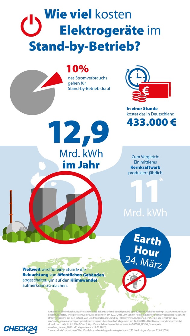 1) Annahmen für die Rechnung: Privathaushalte in Deutschland benötigen pro Jahr 129 Mrd. kWh Strom (https://www.umweltbundesamt.de/daten/energie/stromverbrauch; abgerufen am 12.03.2018). Im Schnitt fallen mindestens zehn Prozent des Haushaltsstromverbrauchs auf den Betrieb von Elektrogeräten im Stand-by (http://ots.de/hxQw6q; abgerufen am 12.03.2018). Die Kilowattstunde Strom kostet aktuell durchschnittlich 29,42 Cent (http://ots.de/yvcS3g; abgerufen am 12.03.2018). 2)http://ots.de/gRMgzM [abgerufen am 12.03.2018] 3)www.wwf.de/earthhour/ [abgerufen am 12.03.2018] 4)http://ots.de/J5AG8M 5)Die vollständige Studie der WIK-Consult mit weiteren Ergebnissen unter: http://www.wik.org/fileadmin/Studien/2017/2017_CHECK24.pdf