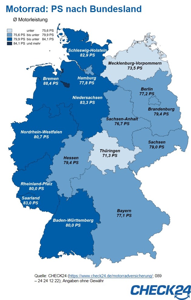 Brandenburg: Motorradquote doppelt so hoch wie in Bremen und Mecklenburg-Vorpommern Bremer fahren im Schnitt mit 88 PS, Thüringer nur mit 71 Pferdestärken