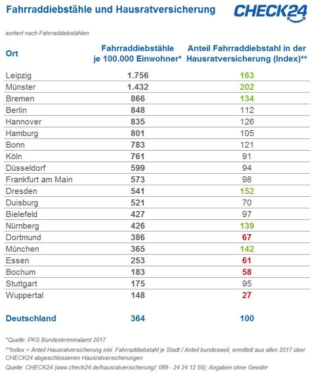 Duisburg nur 600 EuroIn Leipzig und Münster haben überdurchschnittlich viele Verbraucher ihr Fahrrad über die Hausratversicherung abgesichert. 1) Die beiden Städte gehören zu Deutschlands Hochburgen für Fahrraddiebstahl. In Leipzig kamen 2017 mehr als 1.750 geklaute Räder auf 100.000 Einwohner - fast fünfmal so viele wie im Bundesdurchschnitt. 2)