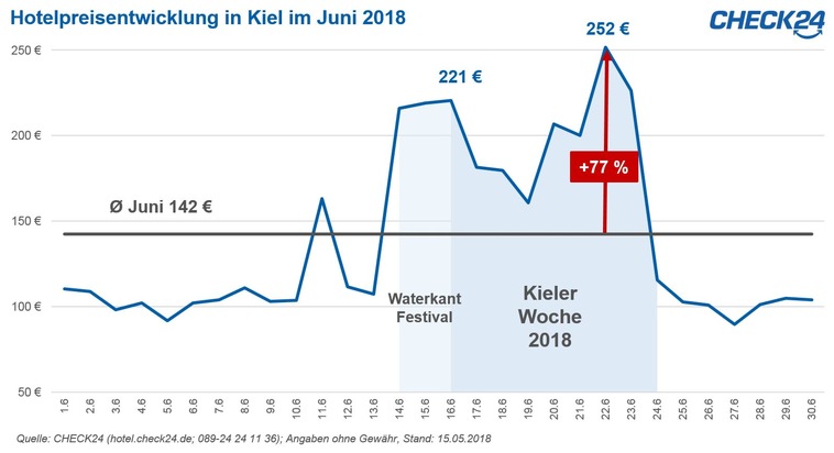 Für Besucher der Kieler Woche werden die Hotelkapazitäten knapp. Zum Betrachtungszeitpunkt gab es im CHECK24-Hotel-Vergleich für das zweite Veranstaltungswochenende zu ausgewählten Kriterien nur noch vier freie Hotels ab 145 Euro pro Nacht. Verglichen mit dem Wochenende danach erhöhen diese Hotels ihre Preise zur Regatta um 35 bis 75 Prozent.