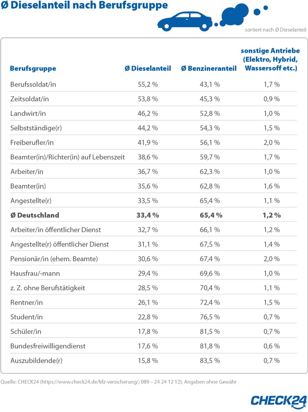 DieselSoldaten fahren häufig Diesel-Pkw. Mehr als die Hälfte der von Berufs- bzw. Zeitsoldaten versicherten Autos haben einen Dieselmotor. Ebenfalls weit vorne im Ranking landen Landwirte und Selbstständige. Hier liegt der Anteil über CHECK24 versicherter Diesel-Pkw bei 46 bzw. 44 Prozent.*