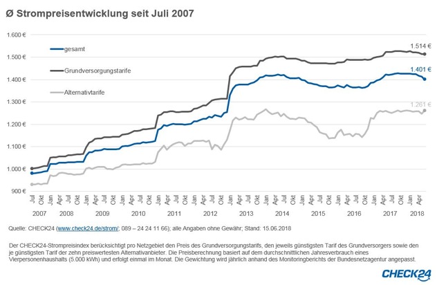 Der Wechsel des Stromversorgers ist nach wie vor sehr lukrativ. In der Grundversorgung zahlt eine vierköpfige Familie im Juni 2018 1.514 Euro, bei Alternativanbietern nur 1.261 Euro - eine potenzielle Ersparnis von 17 Prozent oder 253 Euro pro Jahr.