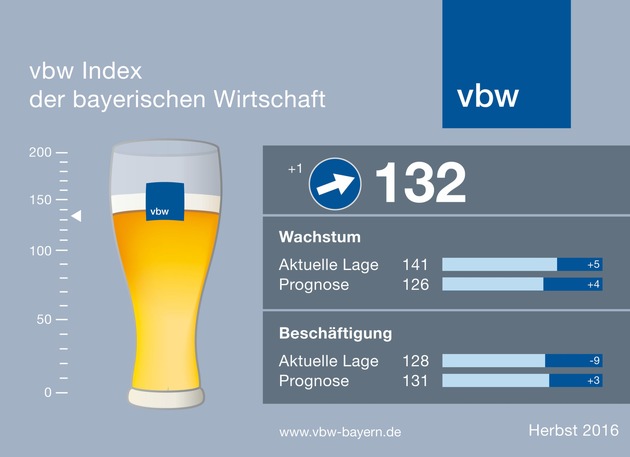 Der zweimal jährlich berechnete vbw Index verbesserte sich im Vergleich zum Frühjahr 2016 insgesamt leicht um einen Punkt auf 132 Punkte. Der Lageindex Wachstum legte um 5 auf 141 Punkte zu, der Prognoseindex Wachstum um 4 auf 126 Punkte. Der Lageindex Beschäftigung sank um 9 auf 128 Punkte. "Man darf diesen Rückgang aber nicht überbewerten. Die Situation auf dem bayerischen Arbeitsmarkt ist so gut, dass eine Verbesserung immer schwerer wird", erklärte Gaffal. Der Prognoseindex Beschäftigung stieg um 3 auf 131 Punkte.