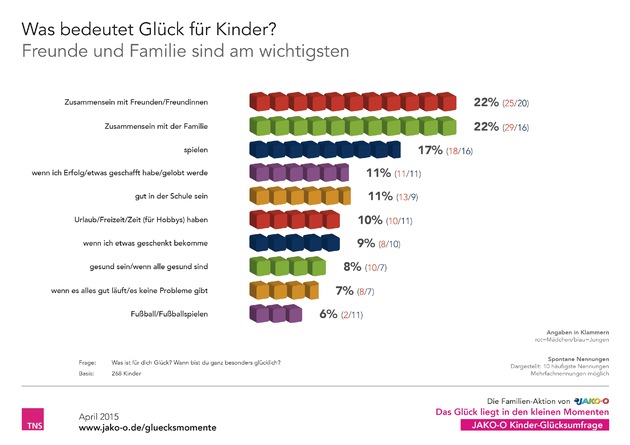 Zum Glücklichsein braucht es nicht unbedingt tolle Geschenke oder Urlaube. Glück bedeutet für die meisten Kinder in Deutschland, wenn sie mit Freunden oder mit der Familie zusammen sein können. Für jeweils 22 Prozent der Kinder sind das die wichtigsten Glücksfaktoren, ergab die aktuelle JAKO-O Kinder-Glücksumfrage. Auf Rang drei liegt das Spielen. Auf dem vierten Platz folgt das Gefühl, etwas geschafft zu haben und gelobt zu werden. Für die Glücksumfrage hat das Sozialforschungsinstitut TNS Emnid bundesweit 268 Kinder und Jugendliche zwischen 3 und 16 Jahren befragt.