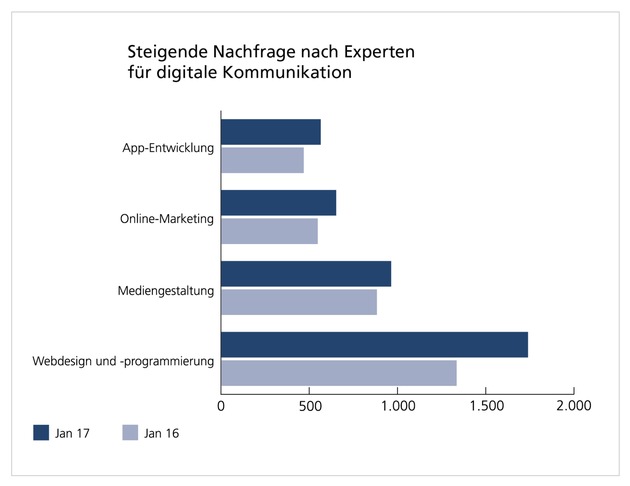 Deutsche Unternehmen suchen verstärkt Fachleute und Spezialisten für die Onlinekommunikation in den Bereichen Webdesign, Online-Marketing und App-Entwicklung. Das ist das Ergebnis einer aktuellen Untersuchung des Stellenmarktes durch den Weiterbildungsspezialisten WBS Training. Danach waren in den untersuchten Berufen aus den Bereichen Marketing/PR/Werbung/Multimedia im Januar 2017 9.500 Stellen ausgeschrieben, ein Zuwachs von über 16 Prozent gegenüber dem Vorjahreszeitraum. Die Online-Spezialisten werden dabei nicht nur von Verlagen und Online-Händlern (zum Beispiel Amazon, C&A oder Zalando) gesucht, sondern verstärkt von immer mehr Unternehmen aus nahezu allen Branchen (zum Beispiel Allianz, Daimler oder Hilti). Neben Online-Marketing-Experten, mit 650 Stellenangeboten, wurden im Auswertungszeitraum Januar 2017 vor allem Webprogrammierer mit Webdesign-Kenntnissen (1740), Mediengestalter (knapp 1.000), Online-Marketing-Experten (650) sowie App-Entwickler (560) gesucht. Bei den Webdesignern war der Anstieg mit über 30 Prozent besonders groß. Insgesamt hatten im Januar dieses Jahres rund 5.100 Unternehmen entsprechende Stellen ausgeschrieben.