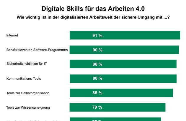 Ob produzierende oder fertigende Unternehmen oder der Dienstleistungssektor - der Einsatz von IT-Technologien ist mittlerweile in nahezu allen Berufen selbstverständlich. Dementsprechend erkennen Personalverantwortliche, wie wichtig es ist, dass Mitarbeiter über die entsprechenden digitalen Skills verfügen und mit verschiedenen Technologien umgehen können. Das bestätigen die aktuellen TNS Infratest-Ergebnisse: Der sichere Umgang mit dem Internet wird von 91 Prozent der Befragten als wichtig bis äußerst wichtig eingeschätzt, dicht gefolgt von berufsrelevanten Software-Programmen (90 Prozent) sowie Sicherheitsrichtlinien für IT (88 Prozent). Zudem sollten Mitarbeiter im Alltag diverse IT-Tools nutzen können, um den Arbeitsfluss effizient zu gestalten. So halten 88 Prozent der Befragten Kommunikations-Tools für wichtig bis äußerst wichtig, gefolgt von Tools zur Selbstorganisation (85 Prozent), zur Wissensaneignung (79 Prozent) sowie cloudbasierten Kollaborations-Tools (75 Prozent).