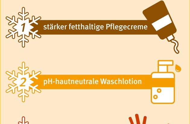 Im Winter braucht die Haut eine noch fetthaltigere Pflege als sonst. "Stärker rückfettende Präparate erkennt man daran, dass sie nur langsam einziehen und einen Fettfilm auf der Haut hinterlassen", erläutert Dr. Kagel. Pflegeprodukte sollten zudem Feuchthaltefaktoren wie etwa Harnstoff (Urea) enthalten. Urea bindet die Feuchtigkeit in der Haut.