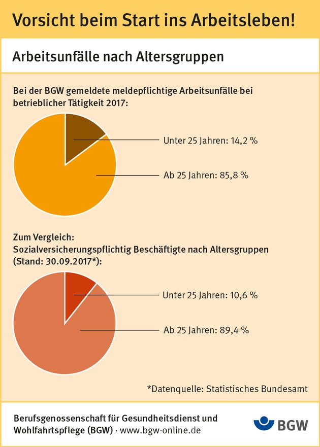 Wer noch nicht so viel Erfahrung hat, trägt im Arbeitsalltag ein besonderes Unfallrisiko. Darauf deuten auch Zahlen der Berufsgenossenschaft für Gesundheitsdienst und Wohlfahrtspflege (BGW) hin. 2017 entfielen 14,2 Prozent der dort gemeldeten meldepflichtigen Arbeitsunfälle bei betrieblicher Tätigkeit auf unter 25-Jährige. Diese Altersgruppe stellte aber gleichzeitig nur 10,6 Prozent der sozialversicherungspflichtig Beschäftigten in Deutschland am Arbeitsort.