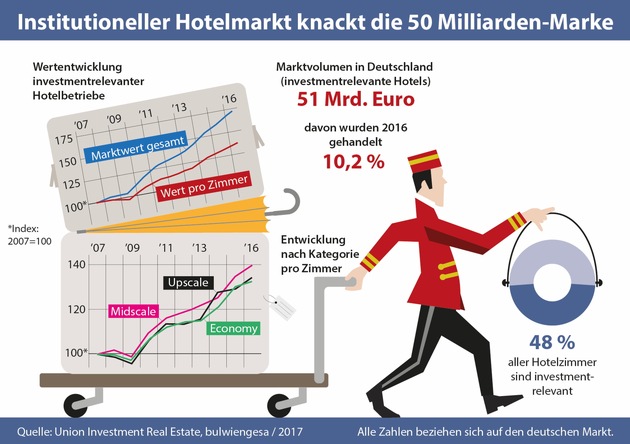 Als investmentrelevantes Angebot wurde von Union Investment und bulwiengesa ein Zimmerbestand von rd. 376.600 Hotelzimmern ermittelt, die sich auf deutsche Klein-, Mittel- und Großstädte verteilen. Der durchschnittlich ermittelte Wert lag 2016 bei rund 135.600 Euro pro Zimmer (Vorjahr: 130.500 Euro).