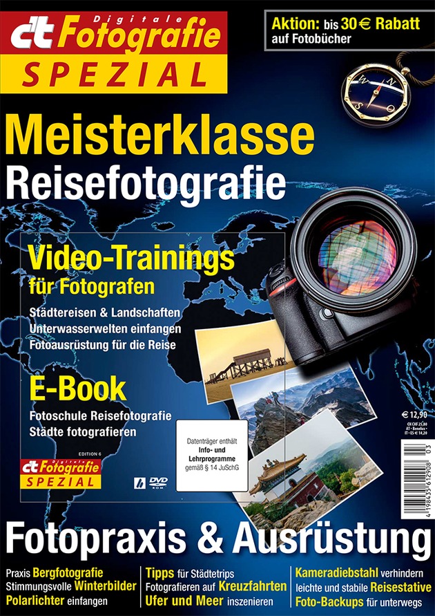 Die c't Fotografie Meisterklasse Reisefotografie ist im Zeitschriftenhandel oder online im heise shop für 12,90 Euro erhältlich. Das eBook kostet 9,99 Euro.