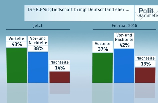 Das Urteil der Deutschen zur EU fällt so positiv aus wie noch nie im Politbarometer. Erstmals glaubt eine Mehrheit von 45 Prozent, dass uns die Mitgliedschaft eher Vorteile bringt, nur für 14 Prozent überwiegen die Nachteile und für 38 Prozent gleichen sich Vor- und Nachteile aus.