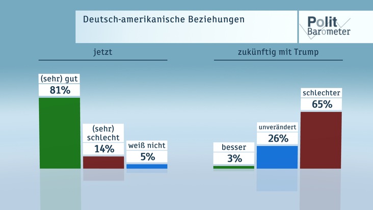 Die aktuellen Beziehungen zwischen Deutschland und den USA bewerten 81 Prozent als sehr gut oder gut, lediglich 14 Prozent bezeichnen sie als schlecht oder sehr schlecht. Allerdings erwarten 65 Prozent, dass sich diese Beziehungen unter einem Präsidenten Trump verschlechtern werden, 26 Prozent gehen davon aus, dass sich daran nichts ändern wird, und 3 Prozent glauben an eine Verbesserung.