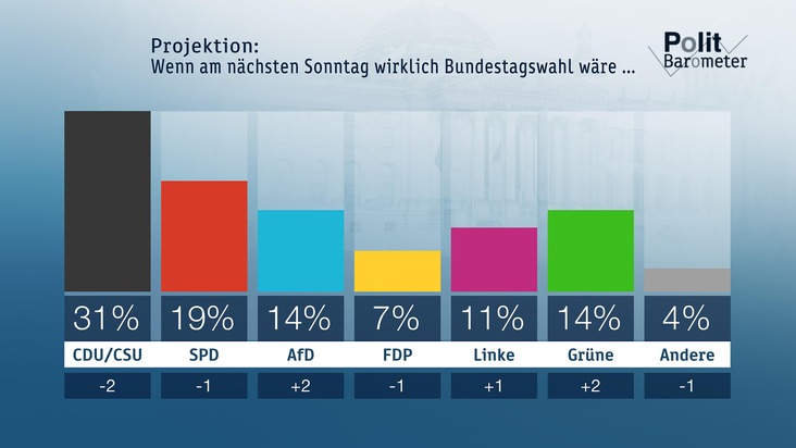 In der Woche der Koalitionsverhandlungen verlieren sowohl Union als auch SPD an Zustimmung. Wenn am nächsten Sonntag wirklich Bundestagswahl wäre, käme die CDU/CSU nur noch auf 31 Prozent (minus 2) und die SPD fiele mit 19 Prozent (minus 1) erneut auf ein Rekordtief. Die AfD könnte dagegen deutlich zulegen auf 14 Prozent (plus 2), genauso die Grünen, die nach ihrem Parteitag am Wochenende jetzt mit 14 Prozent (plus 2) rechnen könnten. Die FDP würde einen Punkt abgeben auf 7 Prozent, die Linke verbesserte sich auf 11 Prozent (plus 1) und die anderen Parteien lägen zusammen bei 4 Prozent (minus 1).