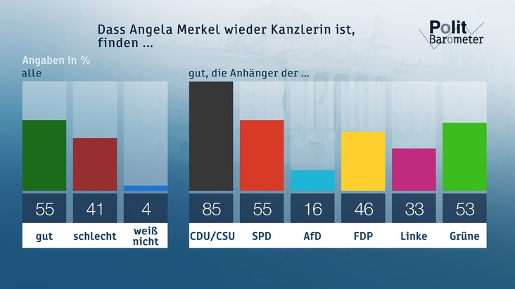 Angela Merkel und ihre Regierungsmannschaft Die Wiederwahl von Angela Merkel zur Bundeskanzlerin finden 55 Prozent aller Befragten gut und 41 Prozent nicht gut. Bei den Anhängern der Union ist die Zustimmung mit 85 Prozent naturgemäß größer als bei den SPD-Anhängern mit 55 Prozent. Eine mehrheitliche Unterstützung findet sie in den Reihen der Opposition mit 53 Prozent nur bei den Anhängern der Grünen. Mit der neuen Regierungsmannschaft sind 45 Prozent eher zufrieden und 31 Prozent eher unzufrieden, allerdings traut sich hier knapp jeder Vierte (noch) kein Urteil zu.