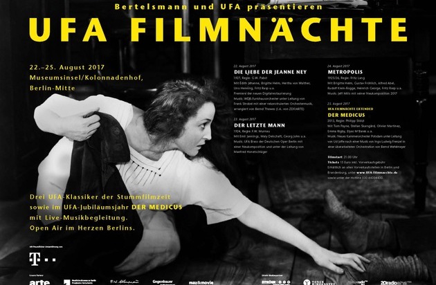 Die UFA Filmnächte locken in diesem Jahr mit einem attraktiven Programm und prominenten Filmpaten erneut Tausende Filmfreunde auf die Museumsinsel in der historischen Mitte Berlins. Dort werden ab heute Abend bis Freitag drei Stummfilmklassiker sowie erstmals auch ein moderner UFA-Film mit Live-Musik unter freiem Himmel präsentiert. Veranstalter sind das internationale Medienunternehmen Bertelsmann und dessen Filmproduktionstochter UFA, die 2017 ihr hundertjähriges Bestehen feiert. Die Filmvorführungen sind stark nachgefragt; es sind aber noch Restkarten verfügbar.