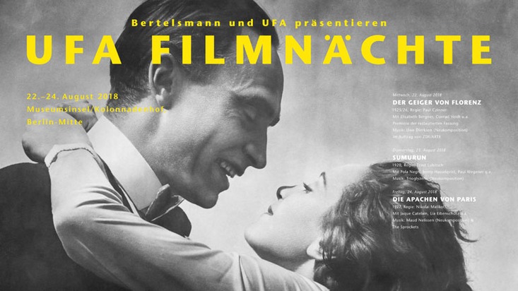 Bertelsmann und UFA präsentieren vom 22. bis zum 24. August 2018 zum achten Mal die UFA Filmnächte in Berlin. An drei Abenden werden frühe Meisterwerke der Kinogeschichte unter freiem Himmel, vor spektakulärer Kulisse und begleitet von Live-Musik zu sehen sein - darunter ein historisches Coming-of-Age-Drama, das mit Unterstützung von Bertelsmann digital restauriert und um lange Zeit verschollene Szenen erweitert wurde.