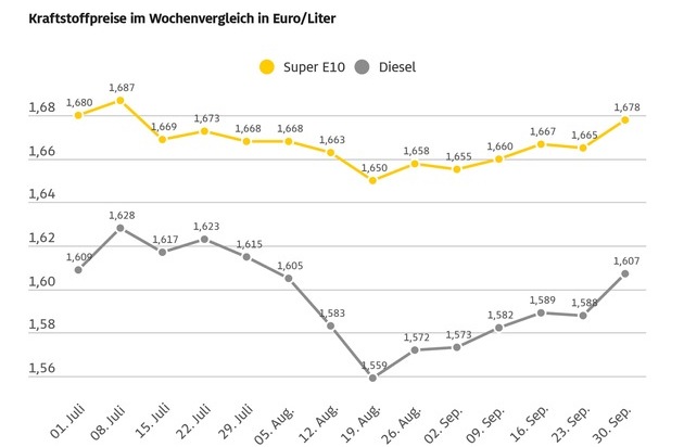 Günstigster Tag zum Tanken war bei beiden Sorten der Monatserste, teuerster Tag war jeweils der 30. September. Super E10 kostete am 1. September 1,654 Euro je Liter und verteuerte sich bis zum 30. September um 2,4 Cent auf 1,678 Euro. Der durchschnittliche Dieselpreis betrug am 1. September 1,569 Euro und kletterte bis zum 30. September um 3,8 Cent auf 1,607 Euro.