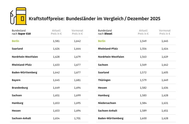 Für die heutige Untersuchung hat der ADAC die Preisdaten von mehr als 14.000 bei der Markttransparenzstelle für Kraftstoffe erfassten Tankstellen ausgewertet und den 16 Bundesländern zugeordnet. Die ermittelten Preise stellen eine Momentaufnahme vom 11. Dezember 2025, 11 Uhr, dar.