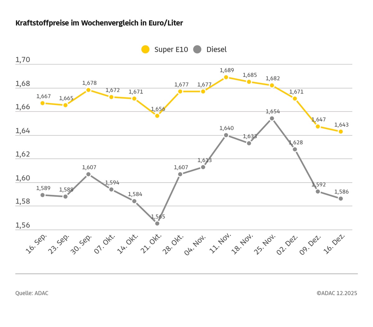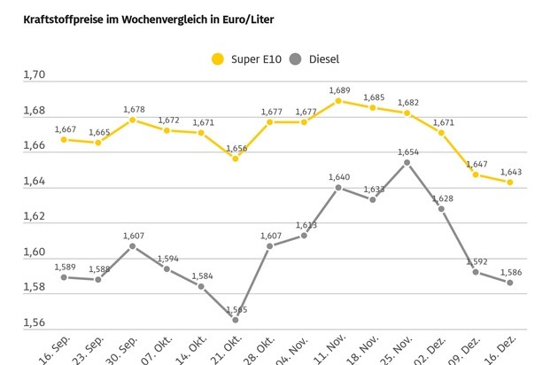 Die Kraftstoffpreise haben im Vergleich zur vergangenen Woche erneut etwas nachgegeben. Für einen Liter Super E10 müssen die Autofahrerinnen und Autofahrer im bundesweiten Mittel aktuell 1,643 Euro bezahlen und damit 0,4 Cent weniger als vor Wochenfrist. Das zeigt die aktuelle ADAC Auswertung der Kraftstoffpreise in Deutschland. Diesel ist um 0,6 Cent billiger und kostet derzeit im Schnitt 1,586 Euro. Super E10 ist damit zum fünften Mal in Folge günstiger als in der jeweiligen Woche zuvor, Diesel zum dritten Mal.