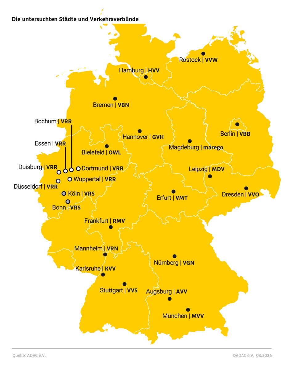 Für die Recherche hat der ADAC KI-Tools verwendet. Mit deren Hilfe wurden die Ticketpreise im Januar und Februar 2026 auf den Webseiten der Verkehrsverbünde erhoben. Als Geltungsbereich wurde jeweils das (innere) Stadtgebiet gewählt. Anschließend wurden die Daten von internen Mitarbeitern überprüft und gegebenenfalls korrigiert.