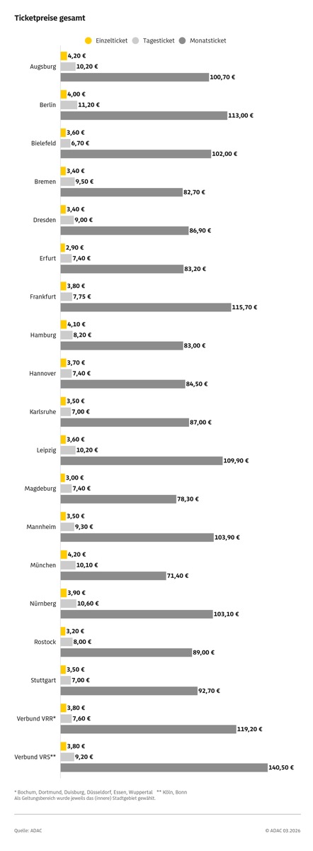 ADAC Erhebung der ÖPNV-Ticketpreise in 25 Großstädten