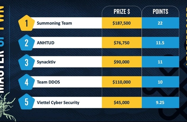 Der Gesamtsieg und der Titel „Master of Pwn“ ging an das Summoning Team, das sich über ein Preisgeld von rund 173.000 Euro freuen konnte. Das Team zeigte einige spektakuläre Exploits in verschiedenen Kategorien, und wird für seine harte Arbeit bei der Vorbereitung mit dem Gewinn des „Master of Pwn“ belohnt.