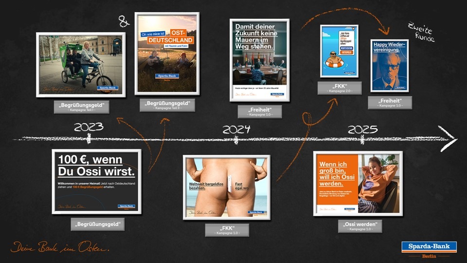 Etwas Provokation mit Augenzwinkern gehört für die Bank dazu: Die Kampagnen wie „Ossi“, „FKK“ oder „Mauerfall“ ecken an – und das ist gewollt. Denn: Merkwürdig ist merkfähig.