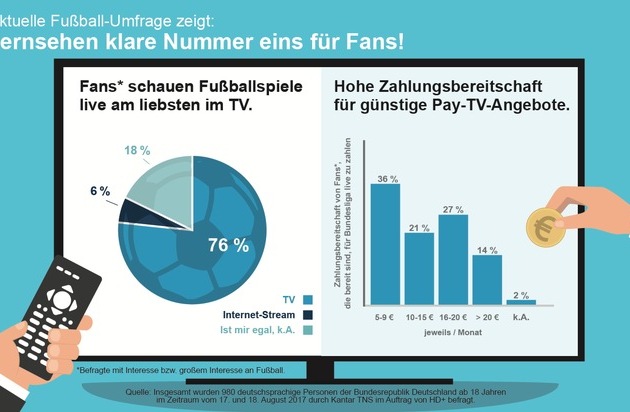 Das Ergebnis einer aktuellen Befragung von Kantar TNS lässt keine Zweifel daran, wo Fans die Tore ihrer Lieblingsmannschaft sehen möchten: 76 Prozent der Befragten mit Interesse bzw. großem Interesse an Fußball fiebern am liebsten live im TV mit, 6 Prozent bevorzugen Fußball via Internet-Stream. Der Anteil der Fans, die sich für Fußball interessieren oder sehr interessieren, liegt insgesamt bei 28 Prozent aller Befragten. Als echte Fußballmuffel outen sich in der repräsentativen Befragung 38 Prozent. Insgesamt wurden 980 deutschsprachige Personen der Bundesrepublik Deutschland ab 18 Jahren im Zeitraum vom 17. und 18. August 2017 durch Kantar TNS im Auftrag von HD+ befragt.