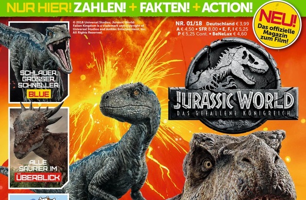 Zum Kinostart des aktuellen Dinosaurier-Abenteuers "Jurassic World: Das gefallene Königreich" erscheint am 07. Juni 2018 das neue Magazin bei Egmont Ehapa Media. Darin enthalten ist alles, was man über die wiederbelebten Dinos wissen muss: Tolle Hintergrundgeschichten, Infos und Fakten zum Kinoerfolg, dinostarke Rätsel und spannende Activity-Seiten. Zudem liegt dem Heft als Extra der Dino-Schreck mit Schaumstoffmunition sowie sechs offizielle Panini-Sticker bei. Die zweite Magazin-Ausgabe erscheint am 19. Juli zudem mit dem offiziellen Panini-Stickeralbum plus sechs weiteren Stickern.