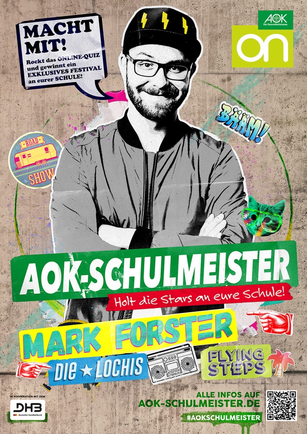 Noch größer, noch bunter und noch aufregender: Beim fünften AOK-Schulmeister können bundesweit alle weiterführenden Schulen um den Auftritt der Live-Acts Mark Forster, DieLochis und der Flying Steps kämpfen. Der Wettkampf beginnt mit einem Online-Quiz. Die besten Schulen treten anschließend in einem Bewegungswettkampf gegeneinander an. Die Gewinner-Schule kann sich über das Fest der Superlative im Juni 2016 auf dem eigenen Schulgelände freuen.