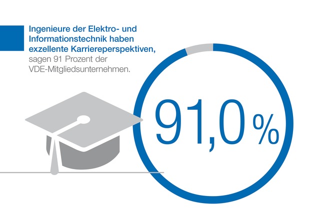 Hochschulabsolventen und Young Professionals in der Elektro- und Informationstechnik haben gute Berufschancen. Das zeigt der neue VDE Tec Report 2017, eine Umfrage unter den 1.300 VDE-Mitgliedunternehmen und Hochschulen der Elektro- und Informationstechnik des Technologieverbandes VDE. 92 Prozent der Befragten sind von den exzellenten Karriereperspektiven von Elektroingenieuren und IT-Experten überzeugt. Fast ebenso viele erwarten, dass der Trend zu New Mobility, Smart Grids, Smart Cities und Industrie 4.0 den Bedarf an Elektroingenieuren und IT-Experten weiter erhöhen (89 Prozent) und der internationale Wettbewerb um Fachkräfte der Elektro- und Informationstechnik sich weiter verschärfen (91 Prozent) wird. 83 Prozent rechnen darüber hinaus damit, dass der Anteil der Elektroingenieure und IT-Experten in Unternehmen weiter wachsen wird.