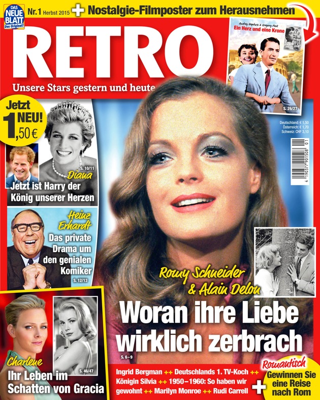 Erstmals erscheint am 7. Oktober RETRO - die Sonderheftreihe von DAS NEUE BLATT - in Deutschland. Auf insgesamt 52 Seiten erfahren die Leserinnen alles über die Höhepunkte und Skandale der Stars der vergangenen 50 Jahre. Das bereits in Frankreich und Tschechien erfolgreich etablierte Magazin präsentiert Herzgeschichten und Schicksale der Promis von gestern und heute, die berühren. Der Magazin-Titel spiegelt sich auch im Layout wider, das durch Retro-Elemente besticht. So werden bei der Covergestaltung sowohl Farb- als auch Schwarz-Weiß-Elemente eingesetzt, um das Gestern von dem Heute auch optisch zu trennen. Die Neuerscheinung richtet sich vorrangig an Frauen ab 50 Jahren. Die erste Ausgabe titelt: "Woran ihre Liebe wirklich zerbrach" und beschreibt die Liebesgeschichte zwischen Romy Schneider und Alain Delon.