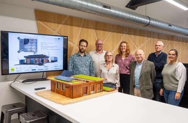 The project team with a model of the mini-hub. Photo: Christophe Gateau / More information via ots and www.presseportal.de/en/nr/177283 / The use of this image for editorial purposes is permitted and free of charge provided that all conditions of use are complied with. Publication must include image credits.