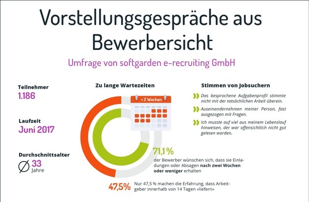 Die Umfrage zeigt, dass Jobsucher in den vergangenen Jahren ungeduldiger geworden sind, was die Geschwindigkeit des Bewerbungsverfahrens angeht. Aktuell räumen 71,1 % der Bewerber Arbeitgebern zwei Wochen oder weniger ein, um nach der schriftlichen Bewerbung zum Gespräch einzuladen oder abzusagen. 2014 waren es 57,3 % (Studie Online-Recruiting 2014 von softgarden). In der Praxis machen aktuell nur 47,5 % der Bewerber die Erfahrung, dass Arbeitgeber innerhalb von 14 Tagen tatsächlich "liefern".