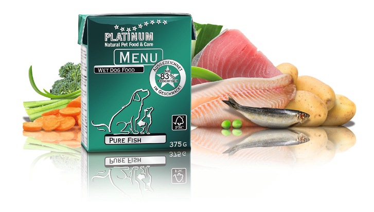 Mit PLATINUM MENU "Pure Fish" gibt es für Hundebesitzer ab sofort eine besonders leckere und natürliche Alternative für die Ernährung ihres Vierbeiners: Die neue Nassnahrungsvariante aus dem Hause des für seine hochwertigen Tiernahrungs- und -pflegeprodukte bekannten Herstellers PLATINUM enthält einen Frischfischanteil von 83 Prozent. Dabei zählen frische Forelle (49 Prozent) sowie frischer Thunfisch und frische Sardine (je 17 Prozent) zu den Hauptzutaten des schmackhaften Nassfutters, das mit seiner ungewöhnlichen Zutatenkombination im Hundenahrungsmarkt eine Besonderheit darstellt. Abgerundet wird die spezielle "Pure Fish"-Rezeptur mit Kartoffeln, Erbsen, Lachsöl, Karotten, Brokkoli und Lauch.