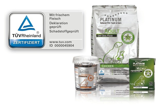 Das Siegel "TÜV Rheinland zertifiziert", das vor Kurzem an die PLATINUM GmbH & Co. KG aus Bingen am Rhein vergeben worden ist, gilt fortan für die komplette gleichnamige Hundenahrungs-Produktfamilie - bestehend aus der Trockennahrung "PLATINUM Adult" und "PLATINUM Puppy", der Nassnahrung "PLATINUM MENU" sowie aus unterschiedlichen Belohnungs-Snacks.