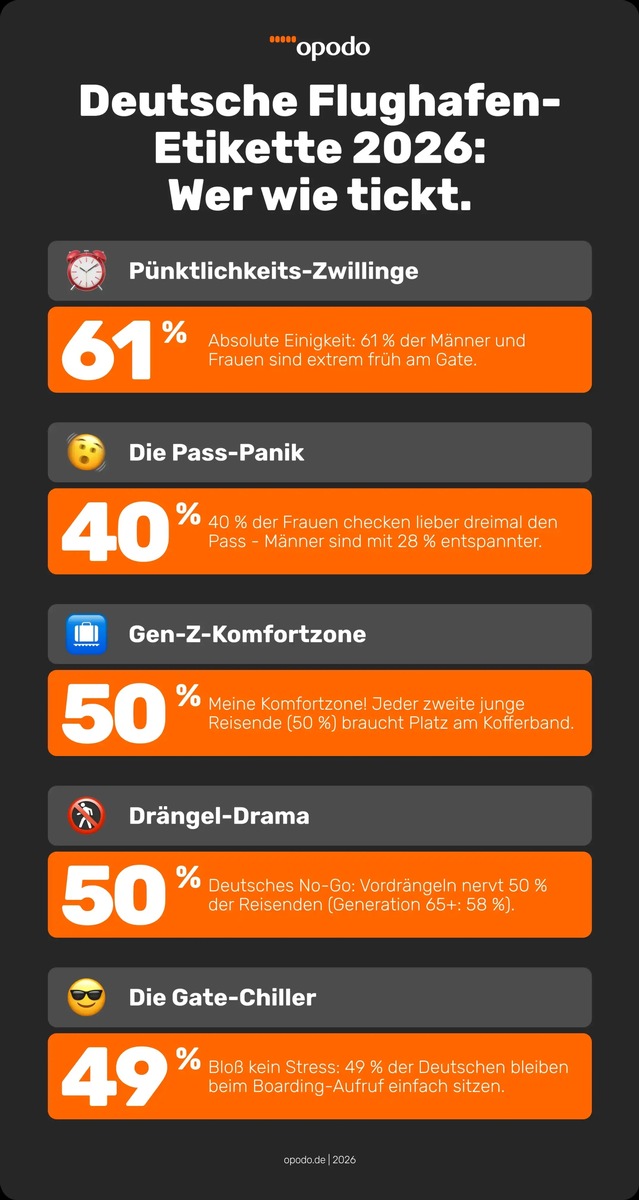 Flughafen-Etikette 2026: Opodo-Studie belegt deutsche Pünktlichkeits-Disziplin und das Bedürfnis nach Personal Space