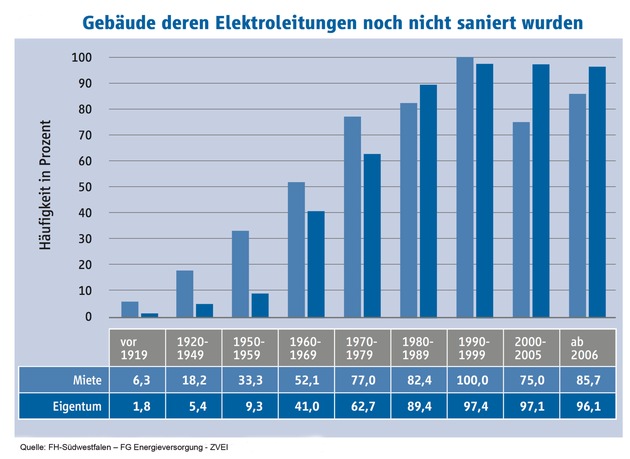 Während in deutschen Haushalten immer mehr moderne Elektrogräte Einzug halten, steckt die Elektroinstallation noch millionenfach auf dem Stand der Nachkriegszeit fest. "Um Brandgefahren vorzubeugen und sich fit für die Energiewende zu machen, müssten in Deutschland Millionen Gebäude elektrotechnisch saniert werden", erklärt Johannes Hauck, bei der Hager Group und Leiter des Lenkungskreises "Elektro-Modernisierung" beim Zentralverband Elektrotechnik und Elektronikindustrie e.V. (ZVEI). "Leider ist aber kaum jemandem bewusst, wie hoffnungslos überaltert die Elektroinstallation vieler deutscher Immobilien ist."
