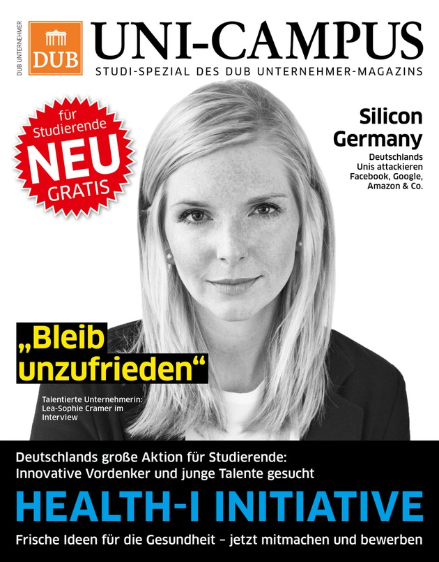 Im Zentrum des DUB UNI-CAMPUS-Konzeptes steht darüber hinaus die Digitalisierung. Das Magazin bietet Service durch Tipps und Orientierung in der Welt des digitalen Unternehmertums. Die aktuelle Ausgabe beispielsweise berichtet aus Silicon Germany. Der Artikel erzählt, wie von deutschen Hochschulinkubatoren geförderte Start-Ups den US-Giganten Facebook, Google, Amazon & Co. Konkurrenz machen wollen. Und schließlich ruft DUB UNI-CAMPUS Studierende dazu auf, die Chancen der großen Initiative Health-i zu nutzen. "Wer sich mit frischen Ideen für das Thema Gesundheit bewirbt, hat gute Chancen gefördert zu werden", erläutert de Buhr den Ideen-Wettbewerb, der auf große Resonanz stößt. "Schon am ersten Tag haben sich bei uns zahlreiche Studierende mit ihren E-Health-Ideen gemeldet." Wie das funktioniert, steht in der Erstausgabe von DUB UNI-CAMPUS.