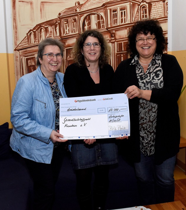 In der Mannheimer Neckarstadt überreichte Jenny Kiefer, Projektleiterin Selbsthilfegruppen der BKK Pfalz, einen Scheck über 13.000 Euro an Marianne Simon, Sprecherin der Regionalen Arbeitsgemeinschaft Selbsthilfegruppen, das Netzwerk unter dem sich ca. 190 Selbsthilfegruppen versammelt haben.
