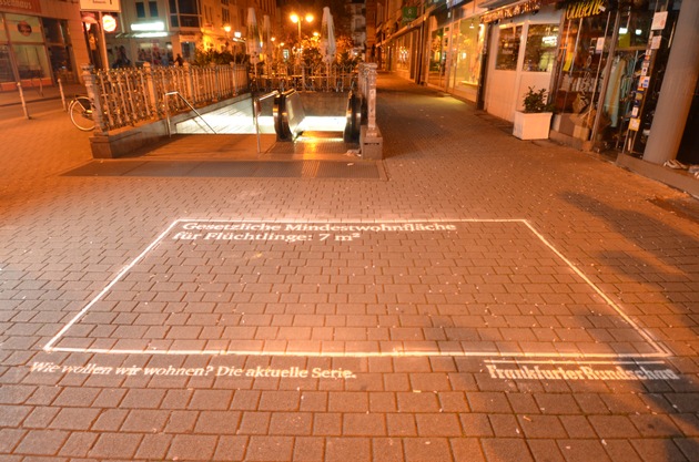 Wie anschaulich das Thema sein kann, beweisen seit Samstagmorgen Kreidebilder auf hochfrequentierten Plätzen und Straßen in Frankfurt: Während einige Kreidebilder einen Quadratmeterpreis-Vergleich vornehmen, stellen andere Kreidebilder plastisch dar, mit wie viel bzw. wie wenig Platz einige Bevölkerungsgruppen tatsächlich auskommen müssen. Neben dieser aufmerksamkeitsstarken Guerilla-Aktion wird außerdem auf Außenwerbeflächen, Infoscreens, in den eigenen Medien und auf Facebook für die Serie "Wie wollen wir wohnen?" geworben.