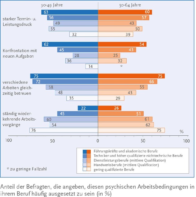 Starker Termin- und Leistungsdruck wird altersübergreifend am häufigsten von Führungskräften und Akademikern genannt. In den Dienstleistungs- und Handwerksberufen bestätigen dies häufiger die Befragten mittleren Alters. Von sich ständig wiederholenden Arbeitsvorgängen berichten vorwiegend Beschäftigte der gering qualifizierten Berufsgruppe (76 %). Hier lässt sich kein nennenswerter Unterschied zwischen den Altersgruppen feststellen.