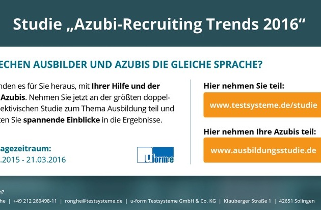 Eine bundesweite Online-Befragung von Ausbildungsverantwortlichen und (angehenden) Azubis zum Thema Azubi-Marketing und -Recruiting hat heute der Solinger Ausbildungsspezialist u-form Testsysteme gestartet. Ausbildungsverantwortliche nehmen unter www.testsysteme.de/studie an der Studie teil, Azubis und Schüler unter www.ausbildungsstudie.de.