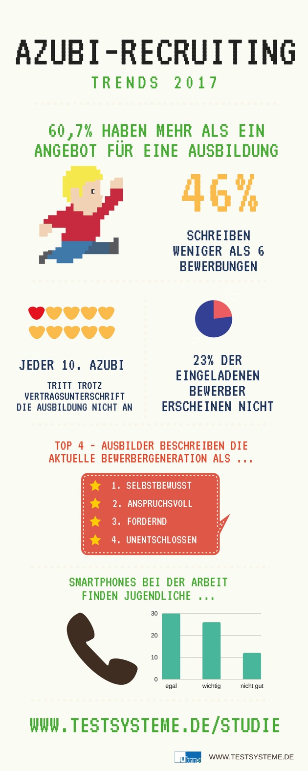 Die Studie "Azubi-Recruiting Trends" hat u-form Testsysteme in diesem Jahr zum achten Mal durchgeführt. Wie schon 2016 hat Prof. Dr. Christoph Beck die wichtigste mehrperspektivische Untersuchung zur dualen Ausbildung wissenschaftlich begleitet. Beck lehrt Betriebswirtschaftslehre mit Schwerpunkt Human Resources Management an der Hochschule Koblenz und ist Herausgeber des Standardwerks Ausbildungsmarketing 2.0. Die Einstieg GmbH hat als Sourcingpartner die "Azubi-Recruiting Trends 2017" unterstützt. Neben der branchenübergreifenden Edition der Studie erscheint in Kürze auch eine "Branchenedition Maschinenbau" - in Zusammenarbeit mit dem Medienpartner MM MaschinenMarkt. Gemeinsam mit dem "Behördenspiegel" gibt u-form Testsysteme 2017 zudem erstmals die "Branchenedition Public Sector" heraus.
